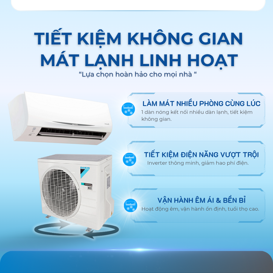Máy điều hoà multi daikin là máy điều hòa không khí với máy nén đơn (dàn nóng đơn) có thể kết nối với nhiều dàn lạnh. Hệ thống hoàn hảo dành cho các loại nhà nhỏ với không gian lắp đặt dàn nóng hạn chế như chung cư, trả lại không gian ban công cho người sử dụng. Bằng cách giảm số lượng dàn nóng, hệ thống điều hòa không khí Multi cũng góp phần làm giảm độ ồn cùng với việc đi dây điện quá nhiều và nhiệt thải tích tụ gây ra hiện tượng quẩn gió cho hệ thống