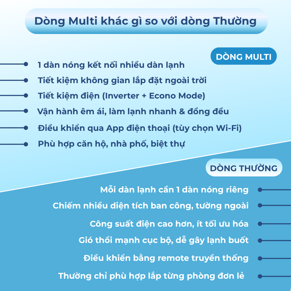 Do các căn hộ nhỏ hoặc chung cư có không gian khá hạn chế cho việc lắp đặt nhiều dàn nóng, Ngoài ra, khi các dàn lạnh được lắp đặt gần với nhau mà không đủ không gian tản nhiệt, hiện tượng quẩn gió có thể xảy ra, ảnh hưởng đển công suất làm lạnh, làm giảm hiệu suất và độ bền của máy điều hòa. Multi S cho phép kết nối 3 dàn lạnh vào 1 dàn nóng, giúp tránh được tình trạng quẩn gió, tăng hiệu suất làm lạnh và độ bền của máy.